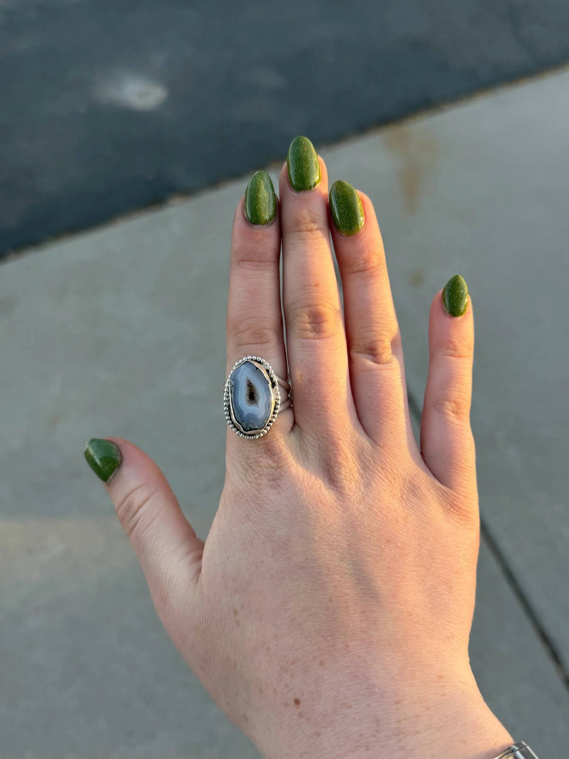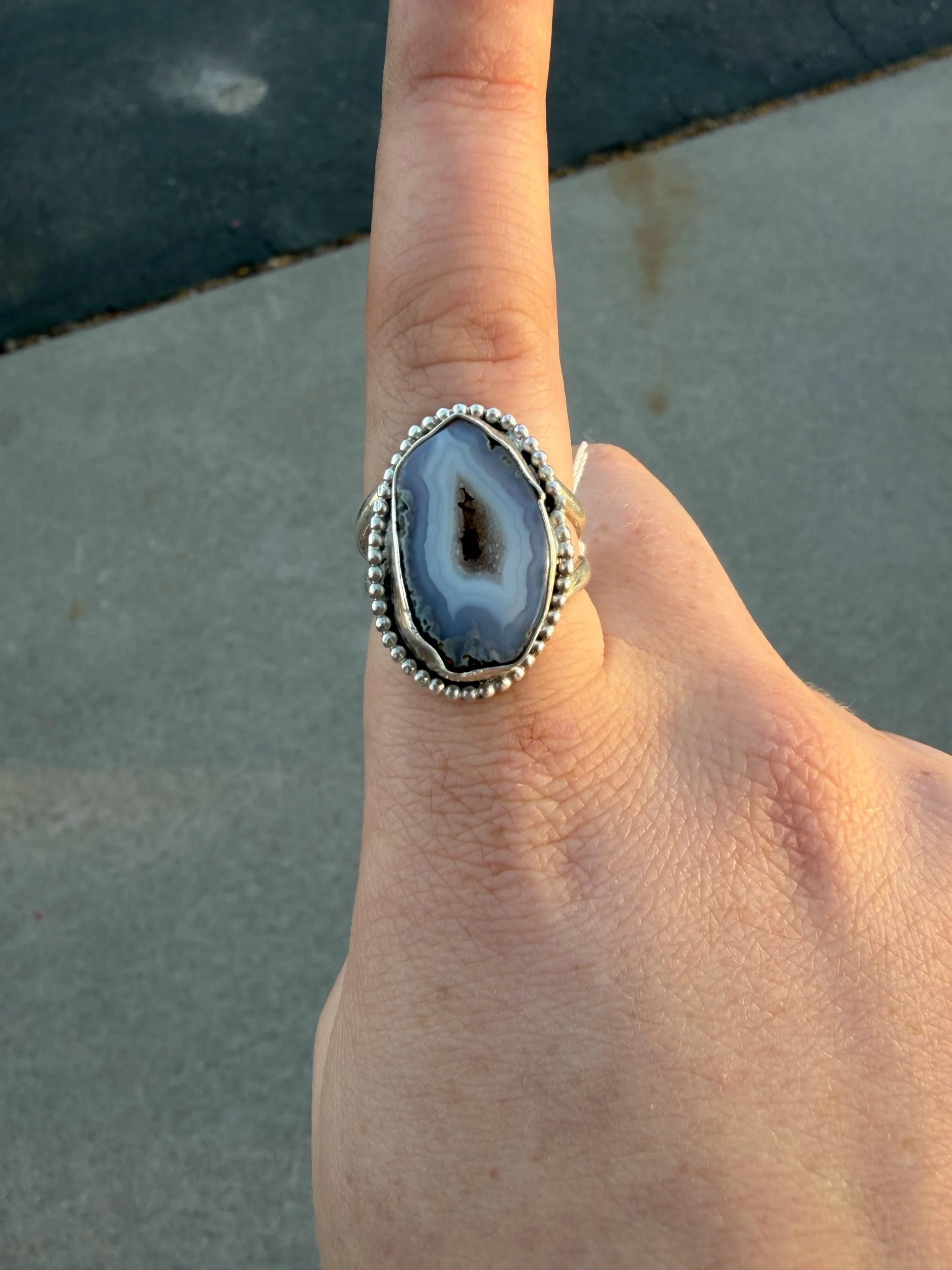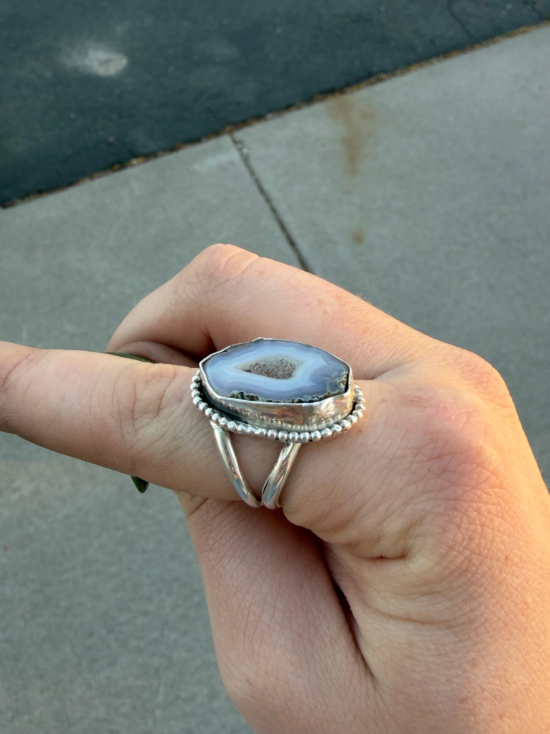 SHOP › Geo Agate Ring size 9 Geo Agate Ring size 9 $80.00 size 9geo agate925 Sterling SilverStraight bezel / Split band / beading detail size 9geo agate925 Sterling SilverStraight bezel / Split band / beading detail Add To Cart Added!