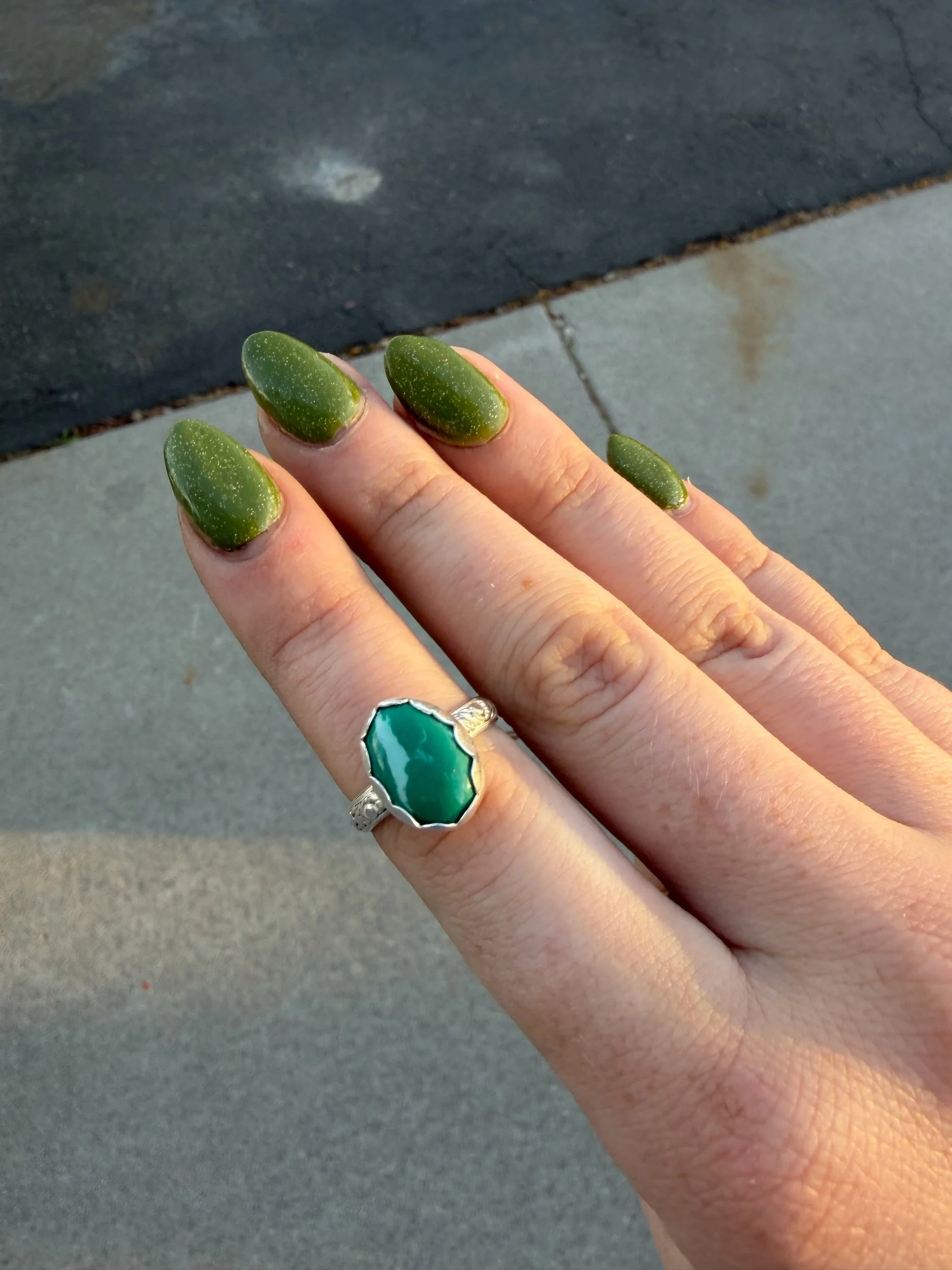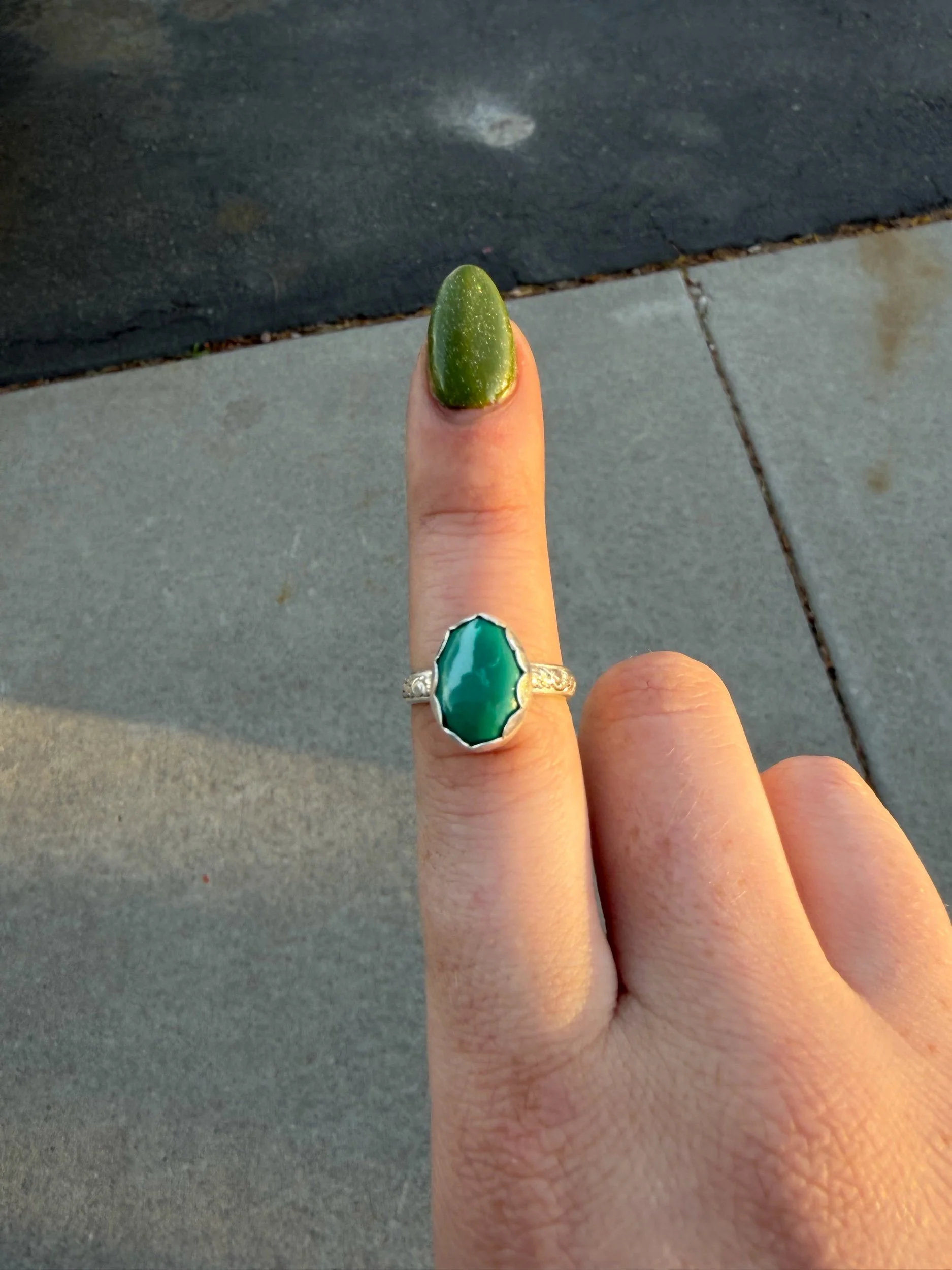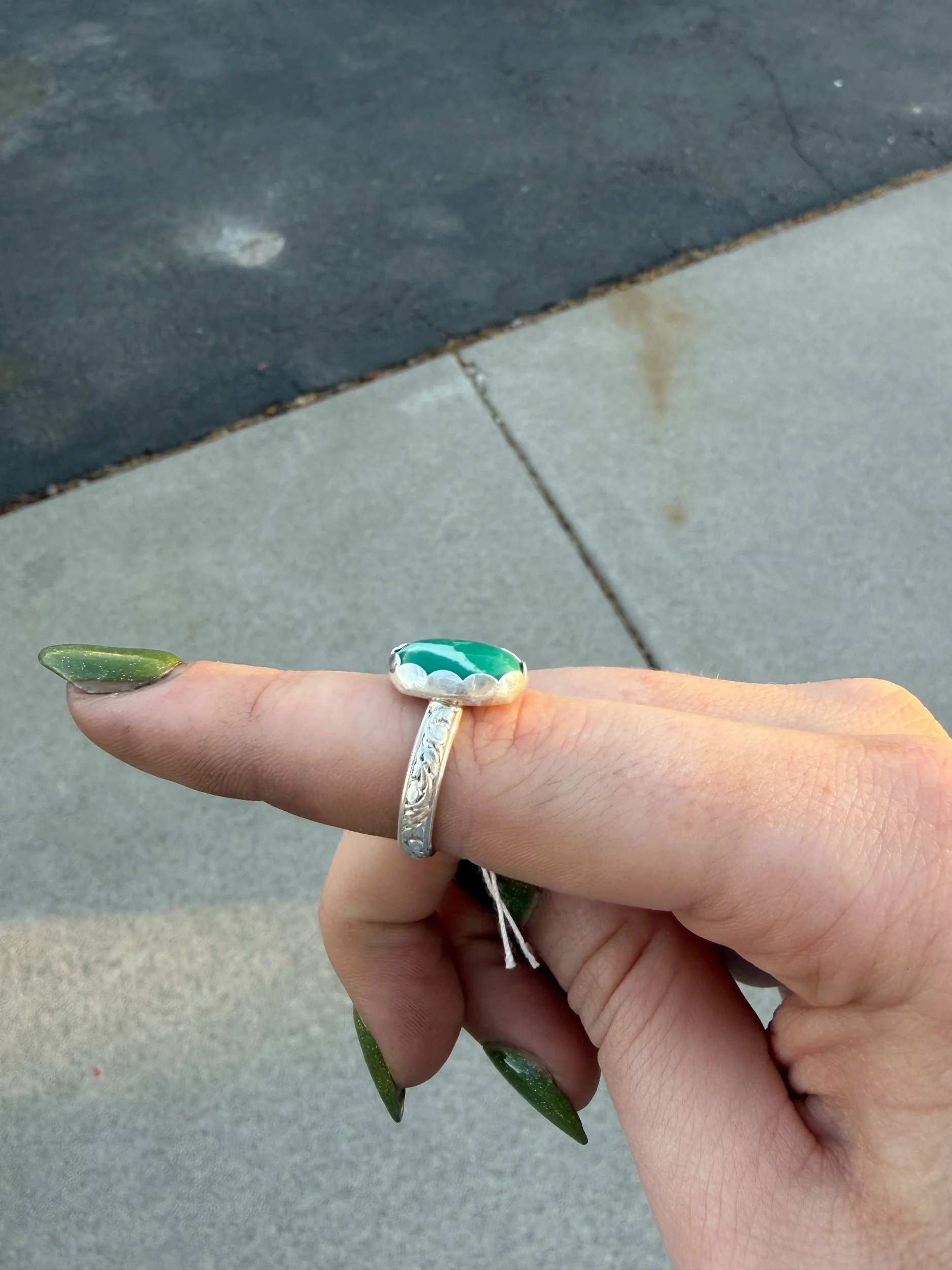 SHOP › Chrysoprase Ring Size 5/6 Chrysoprase Ring Size 5/6 $55.00 SIZE 5/6chrysoprase925 Sterling SilverScalloped Bezel / Floral Band SIZE 5/6chrysoprase925 Sterling SilverScalloped Bezel / Floral Band Add To Cart Added!