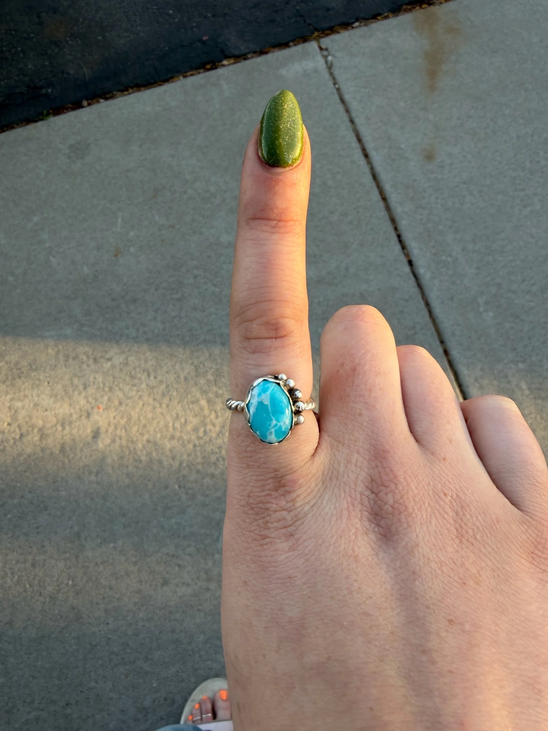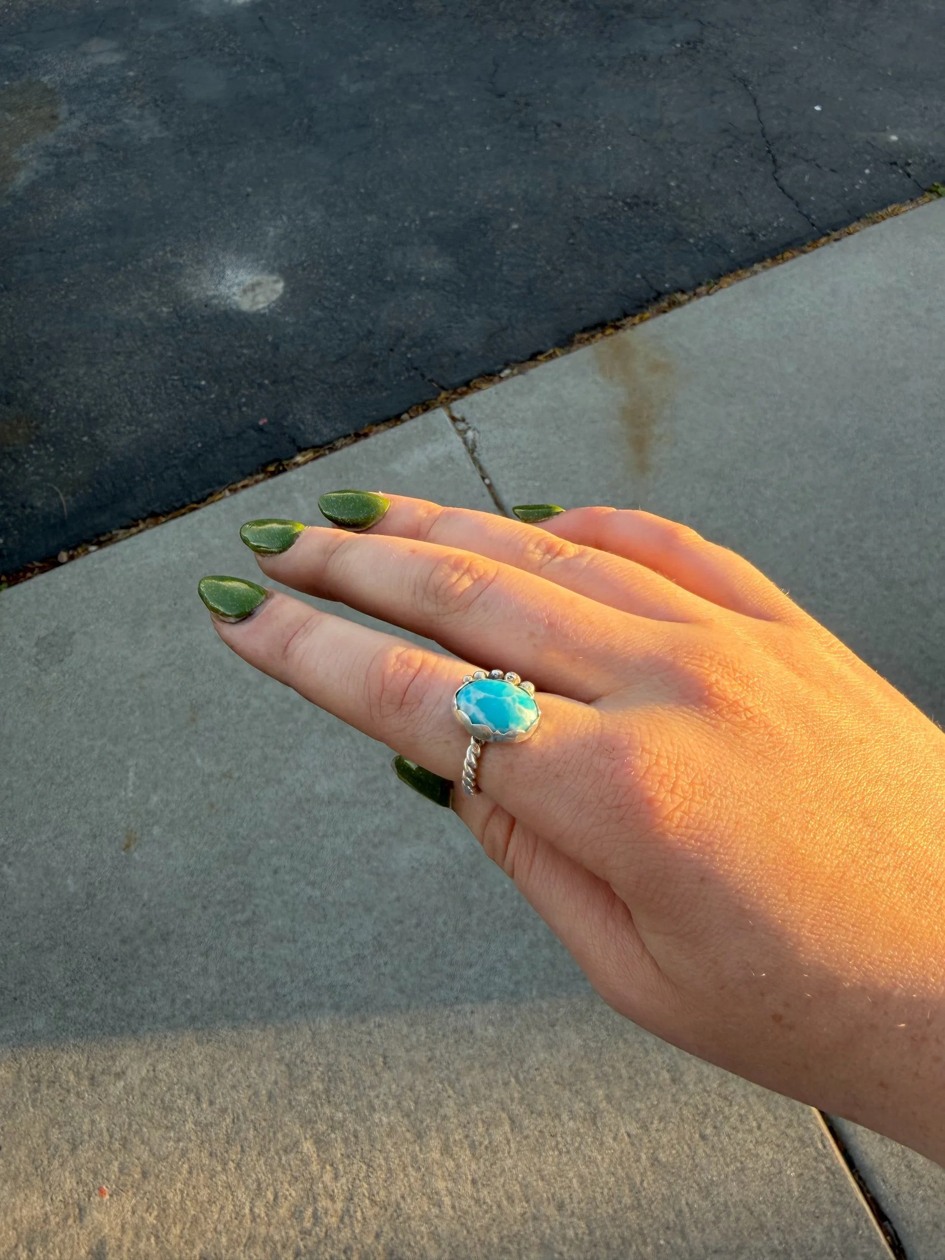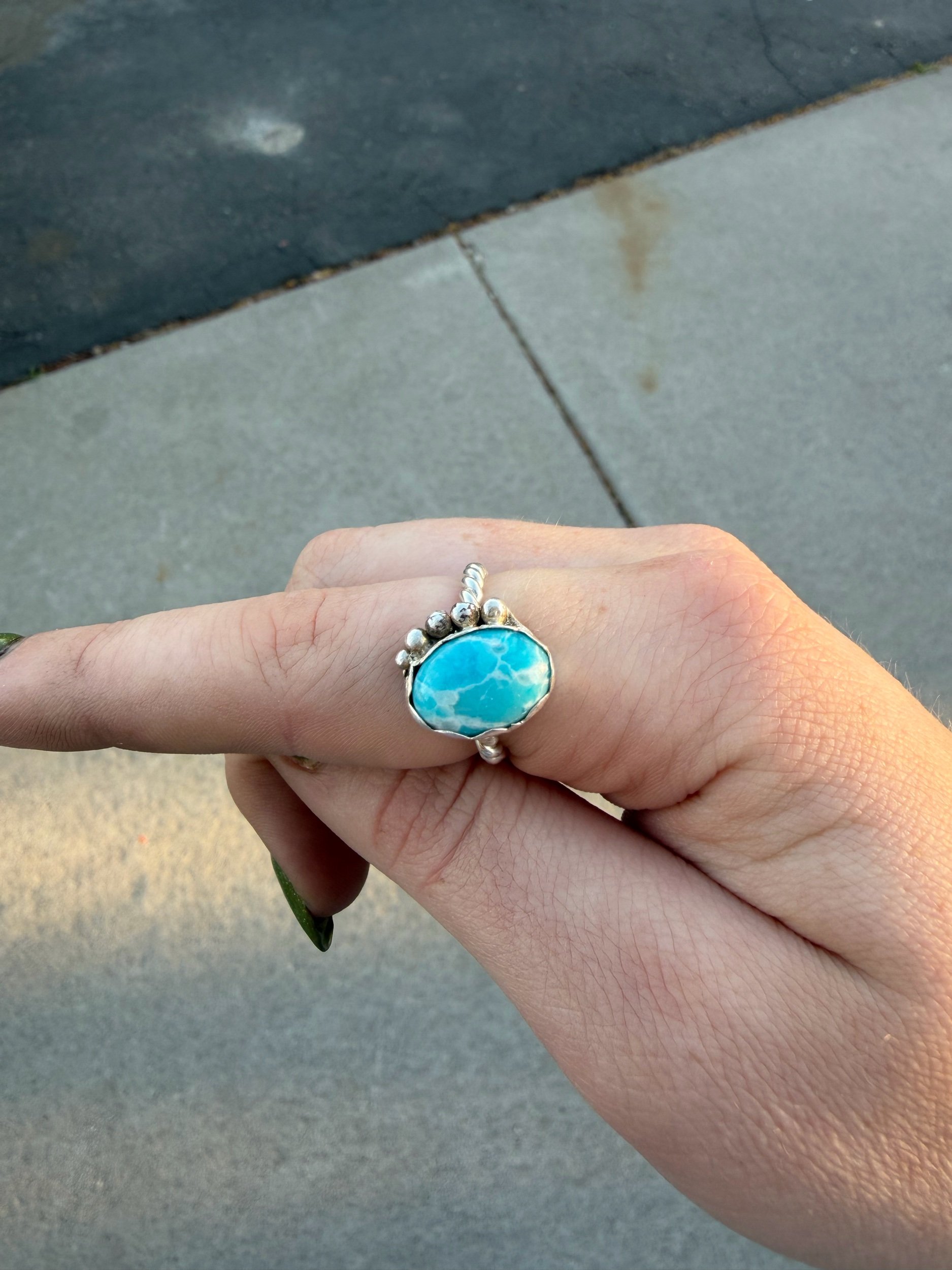 SHOP › SKY BLUE DYED TURQUOISE RING SIZE 7 SKY BLUE DYED TURQUOISE RING SIZE 7 $60.00 SIZE 7SKY BLUE DYED TURQUOISE 925 STERLING SILVERSCALLOP BEZEL / LARGE BEAD DETAIL / TWIST BAND SIZE 7SKY BLUE DYED TURQUOISE 925 STERLING SILVERSCALLOP BEZEL / LARGE BEAD DETAIL / TWIST BAND Add To Cart Added!