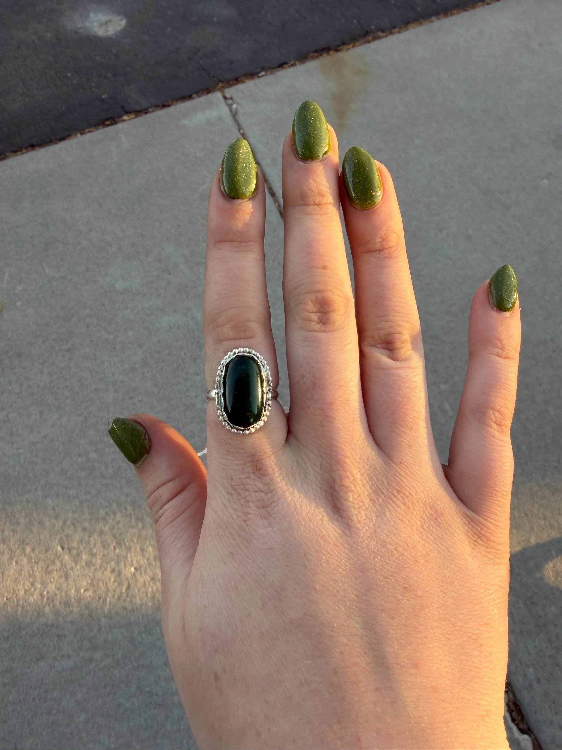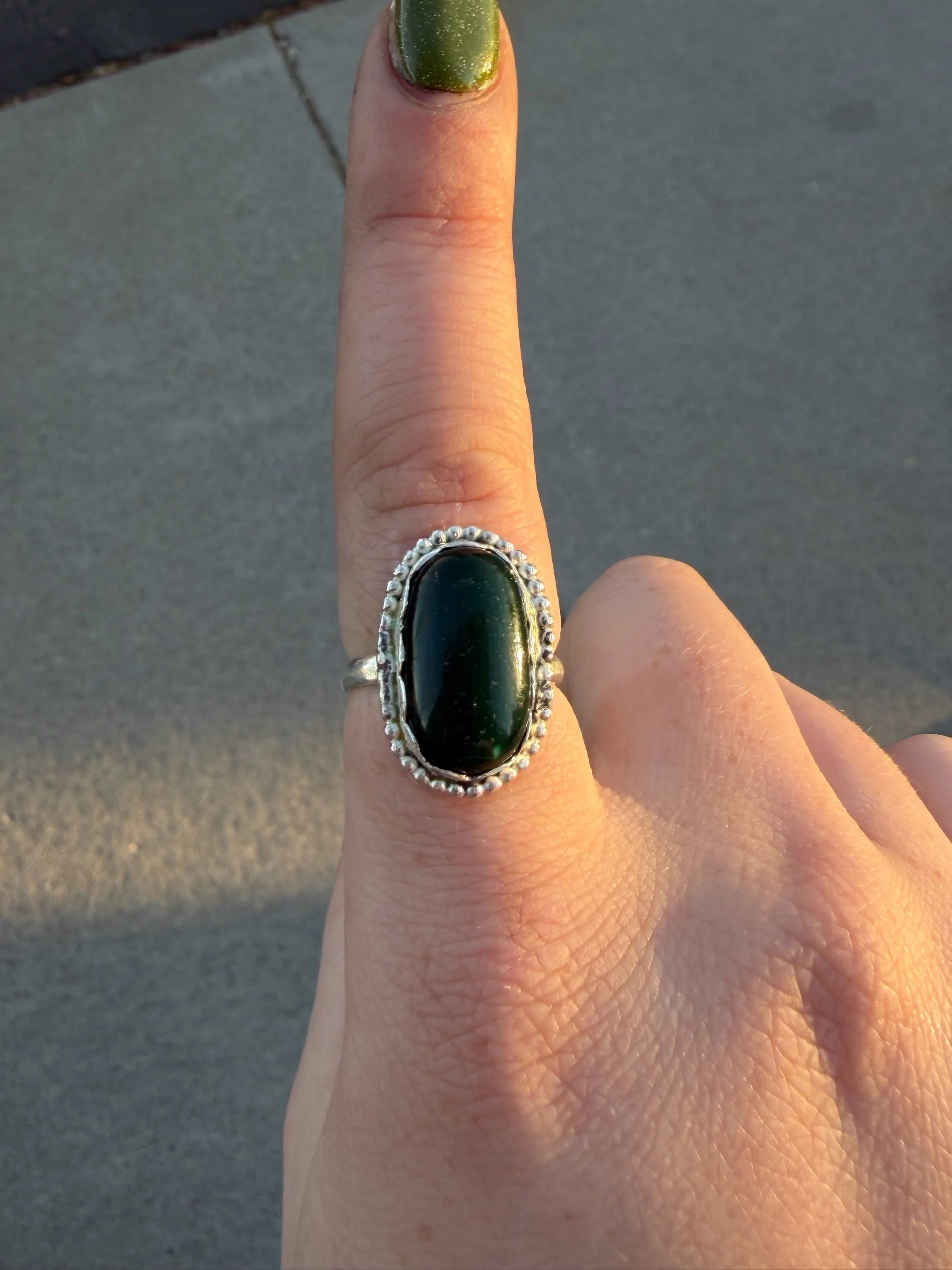 SHOP › Green Stone Ring Size 7 Green Stone Ring Size 7 $55.00 size 7 925 Sterling SilverScallop Bezel, Bead detailing, plain band size 7 925 Sterling SilverScallop Bezel, Bead detailing, plain band Add To Cart Added!